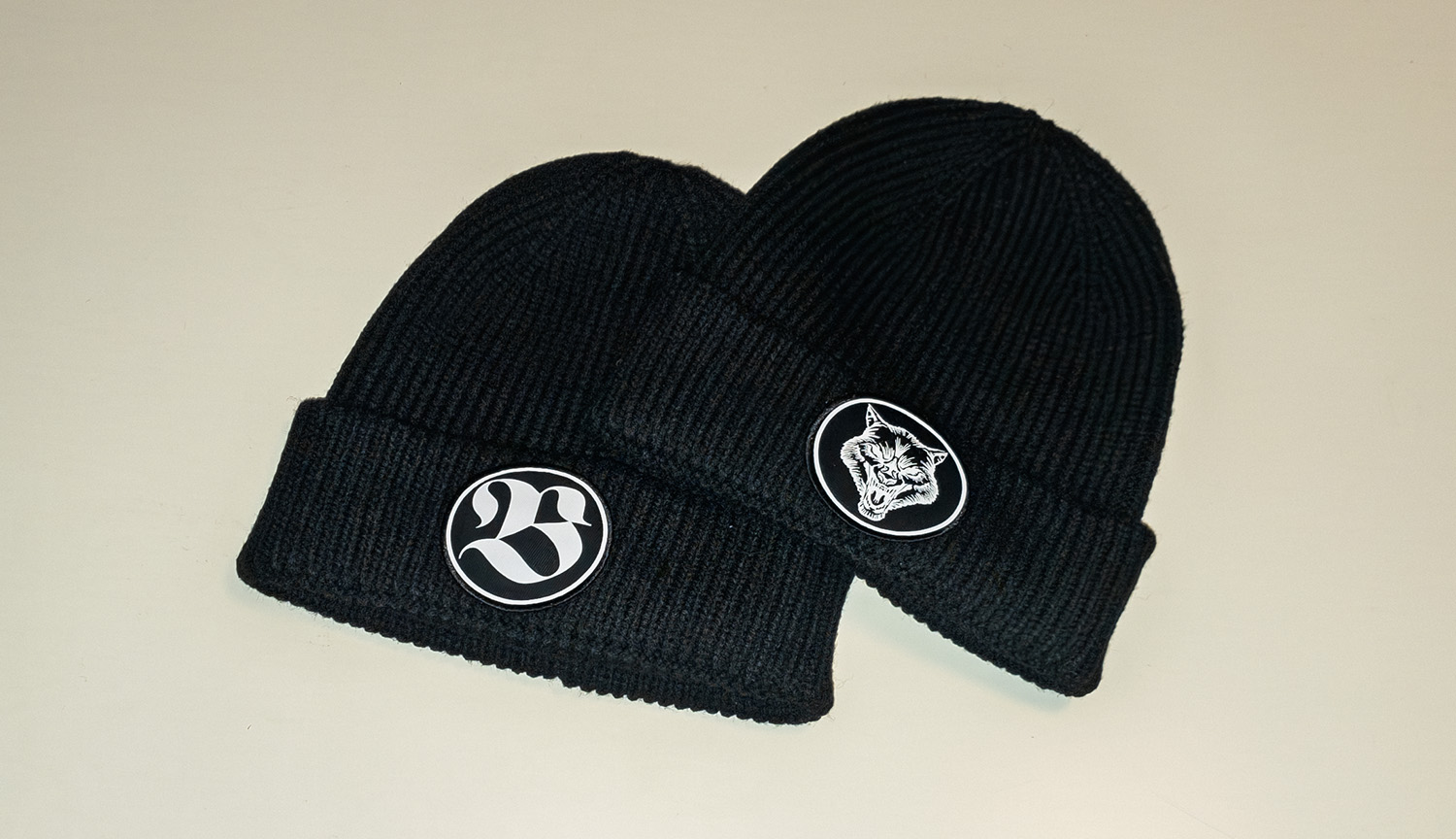 Antingen kan man köpa mössan med ett stilrent B i vårt typsnitt, eller så kan man köpa den med vårt varghuvud. Mössorna är svarta och trycket är i vitt.